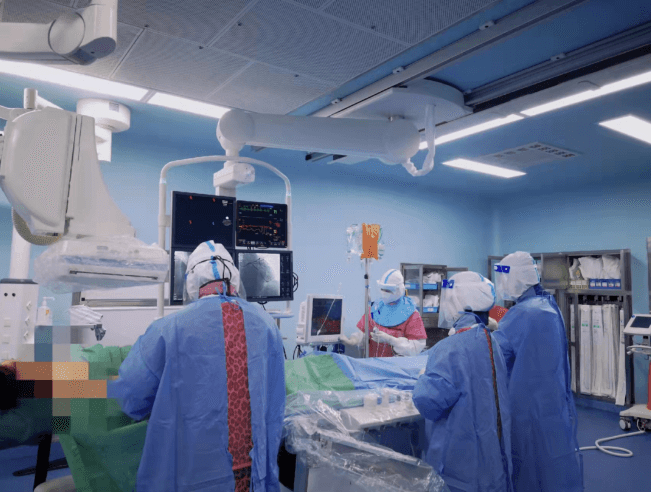 3月13日上午,在心血管病院吴栋梁院长组织和指导下,后勤保障部设立专用通道、蔡萍主任介入团队在高爱倩、姚姬花、张娜护师及孔飞技师等各位同仁的全力配合下,在独立系统百级层流净化手术间,为患者实施了冠脉造影术及支架植入术。介入手术具有特殊性,微创的优势取决于放射性仪器的运用,在射线下进行操作,术者及配台护士均要穿戴大概30多斤重的防护铅衣、铅围脖、铅帽、铅眼镜、无菌一次性手术衣。而为封控期间的患者进行手术,医务人员按照防控规范要求需再穿上防护服、面屏、靴套等。为了减少感染机会他们穿上尿不湿,数层紧密包裹,闷热与负重程度增加了数倍,同时,多层橡胶手套对于精细的介入操作也带来了很大的挑战。为了确保患者的生命安全、减少患者的病痛,当天为7名患者进行了心脏介入手术,手术时间持续8小时之久,全程白衣铠甲均是站立姿势。他们用汗水和责任,用仁心与担当,捍卫了患者生命安全。术后按照《新冠肺炎防控方案第八版》对介入导管室、专用通道等进行终末消杀。