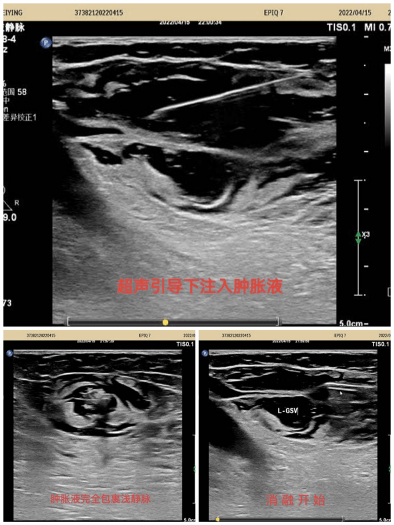 超声引导下标记大隐静脉及曲张静脉部位走行,体表投影部位标记,在彩色多普勒超声静脉模式引导下实时监测,确定穿刺点,局麻下穿刺进针,确定穿刺成功后置入导丝,拔除穿刺针并沿导丝置入7F鞘管,拔出导丝,沿鞘管将消融电极置入要消融的大隐静脉主干内,注入肿胀麻醉液,确认大隐脉闭合,开启移动射频消融导管,消融完毕后拔除鞘管及射频导管再次超声探查隐股静脉交界处,确定无血栓形成。