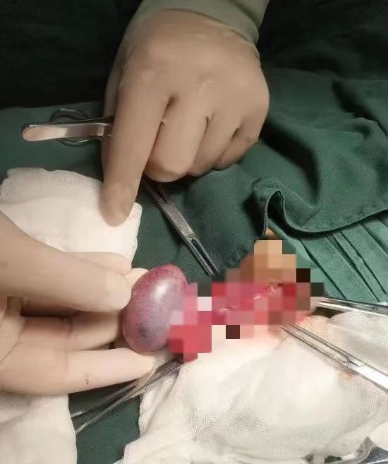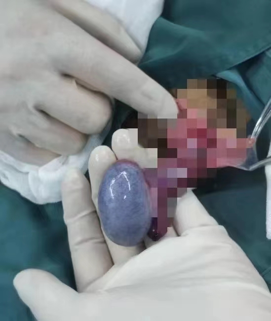 2022年4月24日上午10:50分,一位19岁男孩因突发左侧阴囊区疼痛一小时到超声科检查。首诊医生高杨发现:左侧睾丸内彩色血流信号比对侧明显减少,马上请来上级医生会诊,经过王媛媛责任总医师仔细探查,发现患者左侧睾丸有扭转征象:睾丸轴向发生变化,其内血流信号稀疏,精索扭曲成团、内未探及彩色血流信号,最后请吴建军主任再会诊,诊断为睾丸扭转,高杨立即向临床医生报危急值并快速出具诊断报告。泌尿外科于12:30迅速为患者进行了手术,术中见左侧睾丸附睾缺血呈青紫色,逆时针扭转720°,确诊为左侧睾丸扭转,经复位,左侧睾丸色泽恢复,继续行双侧睾丸固定术。