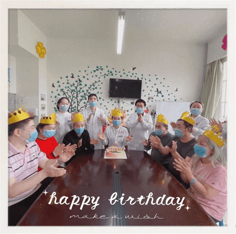 在这个特殊的日子里,刘哲副主任、护士长薛娜、赵静以及科室的医护人员共同为五月出生的住院患者集体过生日,来庆祝这个神圣的节日。在“祝你生日快乐”的歌声中,医护人员为患者戴上生日帽,点燃生日蜡烛,科室医护人员与患者们共同唱起了生日快乐歌曲,送上最真挚的生日祝福,祝愿所有的患者生日快乐,早日康复!希望他们把医护人员当作自己的亲人,医护人员会用自己的双手为患者撑起一片“蓝天”,让他们不再感到孤单和无助,彼此的爱护与支持是最真诚的情感。