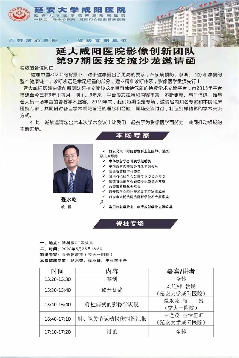 2022年5月25日,延安大学咸阳医院第97期医技交流活动在脑科楼CT/MRI示教室如期举办,会议由延安大学咸阳医院院长助理兼医学影像科主任刘连锋教授主持,特邀西安交大一附院强永乾教授来院授课,我院骨一科杨志奎主任、骨二科侯晓进副主任、康复科梁莉娜副主任等临床、影像专家参加了本次会议。