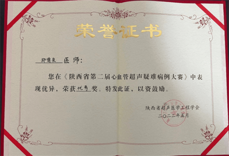 在陕西省超声医学工程学会超声心动图学组主办,西安交通大学第一附属医院,空军军医大学西京医院承办的“陕西省第二届心血管超声疑难病例大赛” 中,通过层层筛选,我科郑德良主治医师在地市级医院为数不多的参赛选手中荣获优秀奖并获点评老师高度评价。