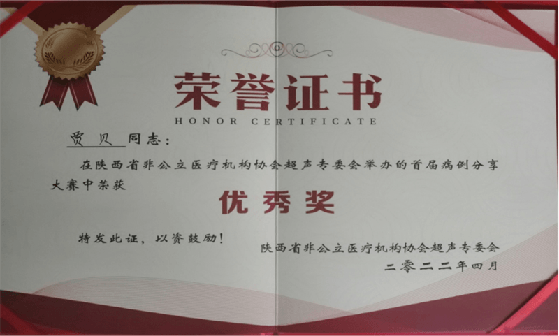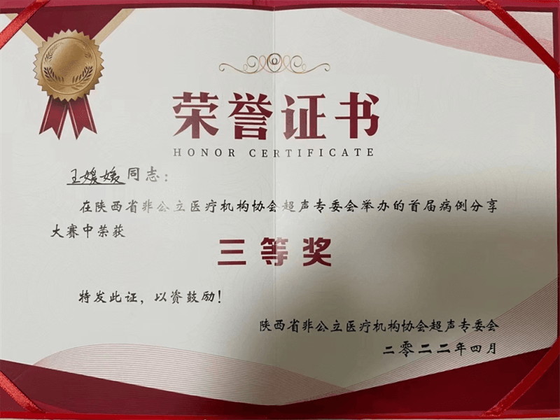 在陕西省非公立医疗机构协会超声专委会主办,西安大兴医院承办的“第一届病例分享大赛”中,通过层层筛选,我科王媛媛主治医师喜获“三等奖”,王莎医师代替贾贝主治医师参赛喜获“优秀奖”。