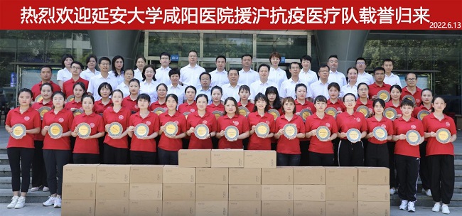 张海涛院长在欢迎词中对援沪医疗队的工作给予了高度评价。他指出,援沪医疗队队员夜以继日地超强度工作,为咸阳争了光,展现了陕西人吃苦耐劳的高贵品质;严谨、规范地落实防护流程的专业风范,医护人员零感染,展示了我院医务人员的专业素养。医疗队在沪抗疫期间的超强凝聚力、执行力和亲和力,体现了延安大学咸阳医院的优秀医院文化。援沪医疗队队员用自己的一言一行,让医院员工“逢山开道、遇水架桥”的铁军精神得到传承、发扬,直面风险,勇往直前、大爱无疆、人民至上的高贵品质得到彰显、升华。援沪医疗队队员是时代英雄,是最可爱的人。医院以援沪医疗队队员为荣,并号召全体员工向援沪医疗队队员学习。