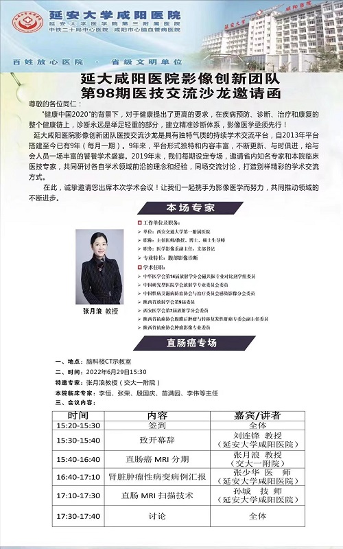 学必求其心得,业必贵于专精。2022年6月28日,延安大学咸阳医院第98期医技交流活动在脑科楼CT/MRI示教室如期举办,会议由延安大学咸阳医院院长助理兼医学影像科主任刘连锋教授主持,特邀西安交大一附院张月浪教授来院授课,我院肿瘤胸外科李伟副主任、消化二科张荣副主任等临床、影像专家及医、技、护共40余人参加了本次会议。