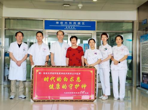 患者赵某,女,70岁,以头昏、言语不利、口角流涎、双下肢沉重无力、头面部麻木不适为主,伴焦虑不安,发病后间断口服药物治疗,症状缓解不明显,曾先后多次在外院住院治疗,效果不佳。听闻我院为脑血管专科医院,便前来诊治。患者反复发生急性脑梗死,合并2型糖尿病、甲状腺功能减退症,祁占宁医生耐心询问病史,根据其病情制定具体的治疗方案,运用中西医结合理论及方药治疗后症状明显改善,并在住院期间对患者进行心理疏导,患者康复出院。出院后祁占宁医生仍坚持做随访工作,及时了解患者情况,提醒按时服药,定期做检查。正是这位始终以“爱心、诚心、耐心、细心、责任心”为服务理念的医生,打动了患者,这次他们不顾路途遥远,专程将牌匾从家运送到医院,就是为了表达对科室医护人员的感谢之情!
