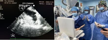 术中我们介入团队熟练配合,封堵器精确定位,完美释放,食道超声证实定位准确,压缩比20%,牵拉实验封堵器无移位,锚定牢靠,符合PASS原则。释放后造影证实封堵器完全封闭左心耳,超声示无残余分流。