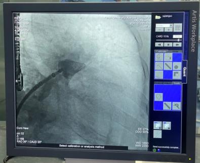 穿刺房间隔后置入6F猪尾导管,于CAU20°,RAO35°进行左心耳造影,可见左心耳为大角度反鸡翅形,测量左心耳开口26mm,深度25mm。各位在线的专家有张玉顺教授、宋治远教授、胡浩教授等,进行了热烈讨论后,一致认为该例手术难度较大,封堵伞不易释放。