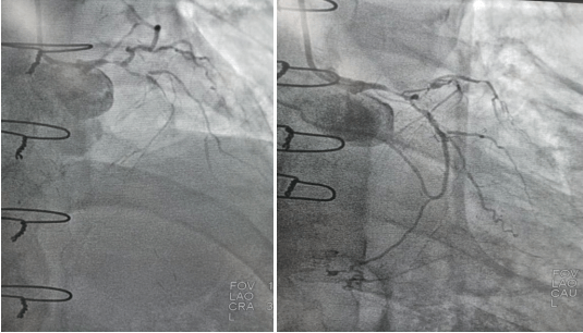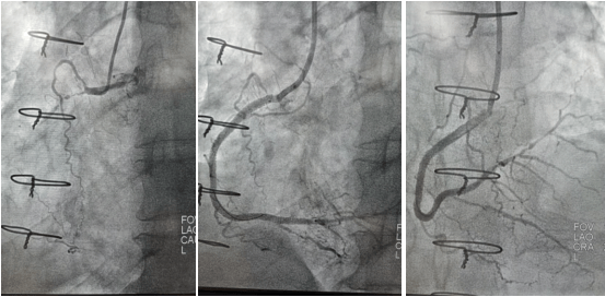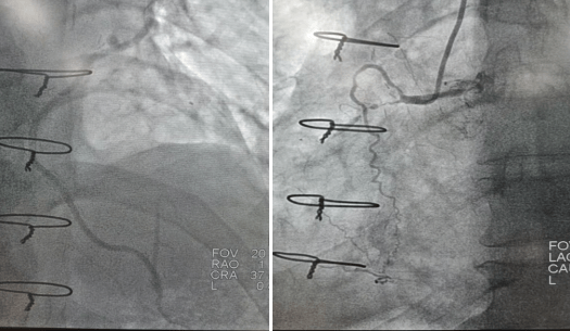2022年9月16日行冠脉造影术,造影结果示:左主干末端99%狭窄,LAD近段100%闭塞,LCX开口及近段95%狭窄,乳内动脉-左前降支血管通畅,RCA近段100%闭塞,大隐静脉桥血管未见,考虑闭塞。