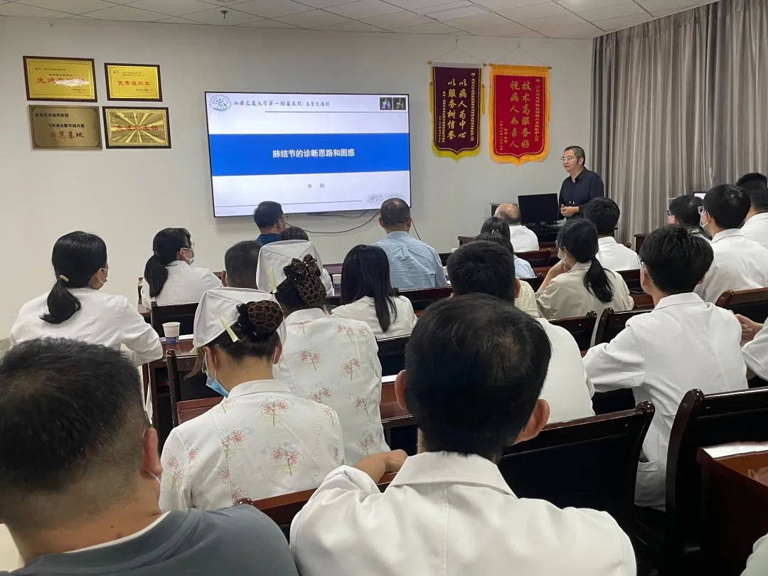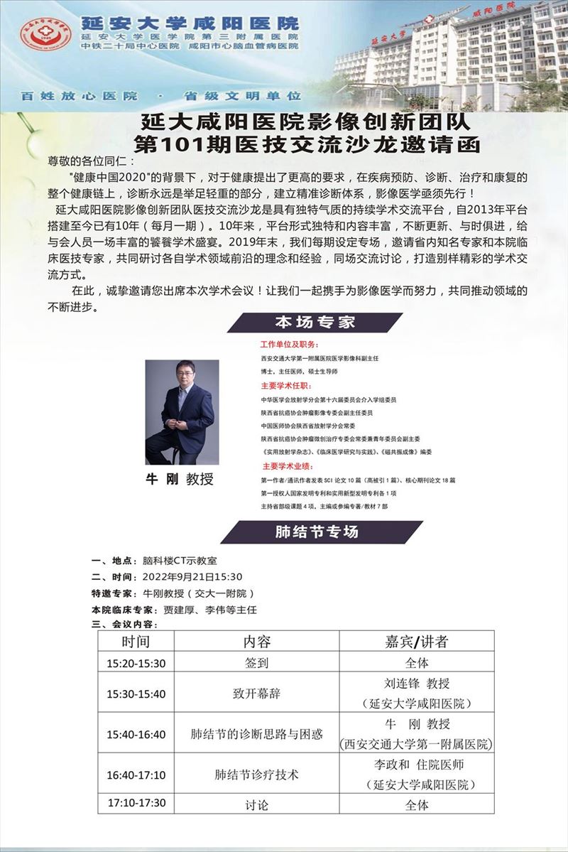 2022年9月21日,延安大学咸阳医院第101期“医技交流沙龙”活动在脑科楼CT/MRI示教室成功举办,会议由延安大学咸阳医院院长助理兼医学影像科主任刘连锋教授主持,特邀西安交通大学第一附属医院牛刚教授来院授课。西安北车医院医学影像科张涛主任团队,我院呼吸内科贾建厚主任团队、肿瘤胸外科李伟副主任及医学影像科医、技、护共50余人参加了本次会议。