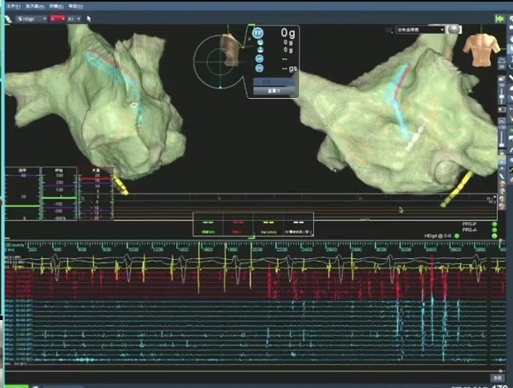 患者袁女士、67岁,常年受胸闷、气促的影响辗转多家省、市级医院,曾行冠脉造影基本正常、心脏彩超检查无明显心脏瓣膜病变,诊断为:“心力衰竭 心房颤动”,常年服用药物治疗,但效果不佳。近期,袁女士再因胸闷、气短、心悸来我科住院治疗,经精心药物治疗后,使患者症状得以控制。考虑到患者的实际情况,蔡萍教授团队对患者病情进行仔细分析,考虑为:“持续性心房颤动并射血分数降低的心力衰竭”, 房颤发作导致心功能下降,诱发心力衰竭。目前房颤治疗的主要方式是射频消融,传统的环肺建模耗时较长,加之术中需冷盐水灌注,患者存在长期心功能不全,术中难以长时间平躺。基于以上困难,蔡萍教授团队经术前充分讨论后,决定使用新一代网状高密度标测导管(HD Grid)完成射频消融术。该导管特定的闭环网状设计、密集的电极间距和双向感知的算法优势,使得术中短时间内即对心房实现完整的基质标测。积极术前准备后,于2022年11月17日由蔡萍教授、赵娟副主任、梁田责任总在该技术的辅助下对心房实施精准消融,患者转复窦性心律,历时2小时余,手术顺利完成。术后患者症状明显改善、活动耐力明显提升,术后第3日复查心脏彩超EF值从术前36%提升至41%,LA从55mm缩小至49mm。目前患者已康复出院。