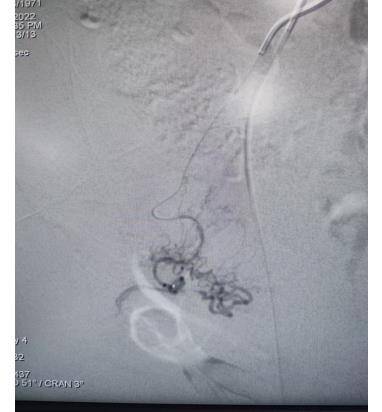但患者还有子宫肌瘤长年不规则出血,支架术后需要抗凝、抗血小板聚集治疗,这样加重了子宫异常出血;半年前患者因长期子宫出血不止导致重度贫血进行输血治疗,为此患者痛苦不堪;经过详细检查患者合并有子宫肌瘤,经过崔旭辉主任认真研判,考虑绝经期女性,该患者目前最佳选择是行子宫动脉栓塞术。