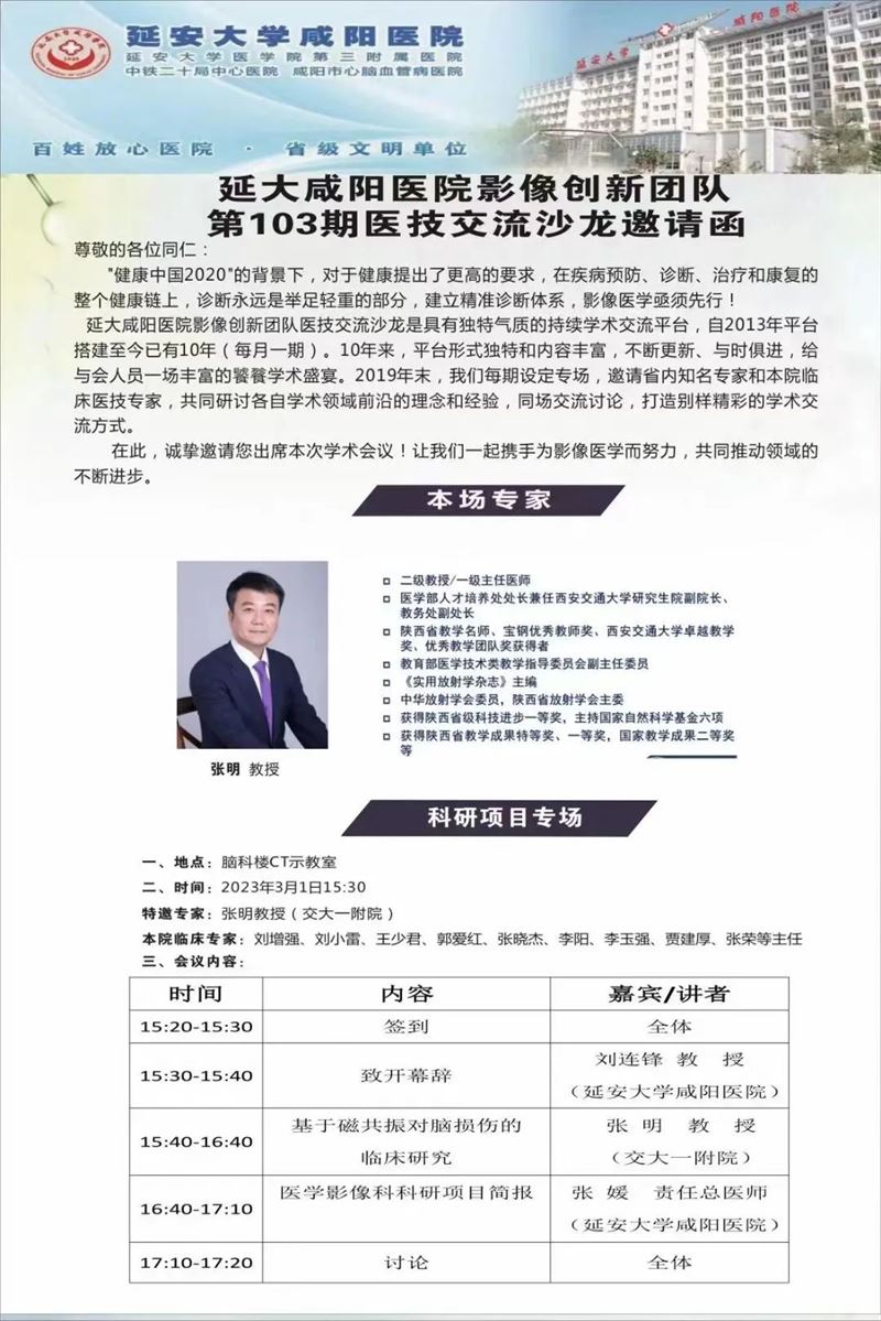 2023年3月1日,延安大学咸阳医院第103期“医技交流沙龙”活动在脑血管病院大楼CT/MRI示教室成功举办,本次会议由延安大学咸阳医院院长助理兼医学影像科主任刘连锋教授主持,特邀陕西省放射学会主任委员张明教授前来授课指导。咸阳市第一人民医院放射科寇思杰主任,我院呼吸内科贾建厚主任、神经内科VIP一病区郭爱红主任、老年病科王少君主任、神经外科一病区刘增强主任、普通外科二病区李玉强主任、放射科李彦龙主任及215医院影像科张华文主任团队成员等临床、影像专家及医、技、护共40余人参加了本次会议。