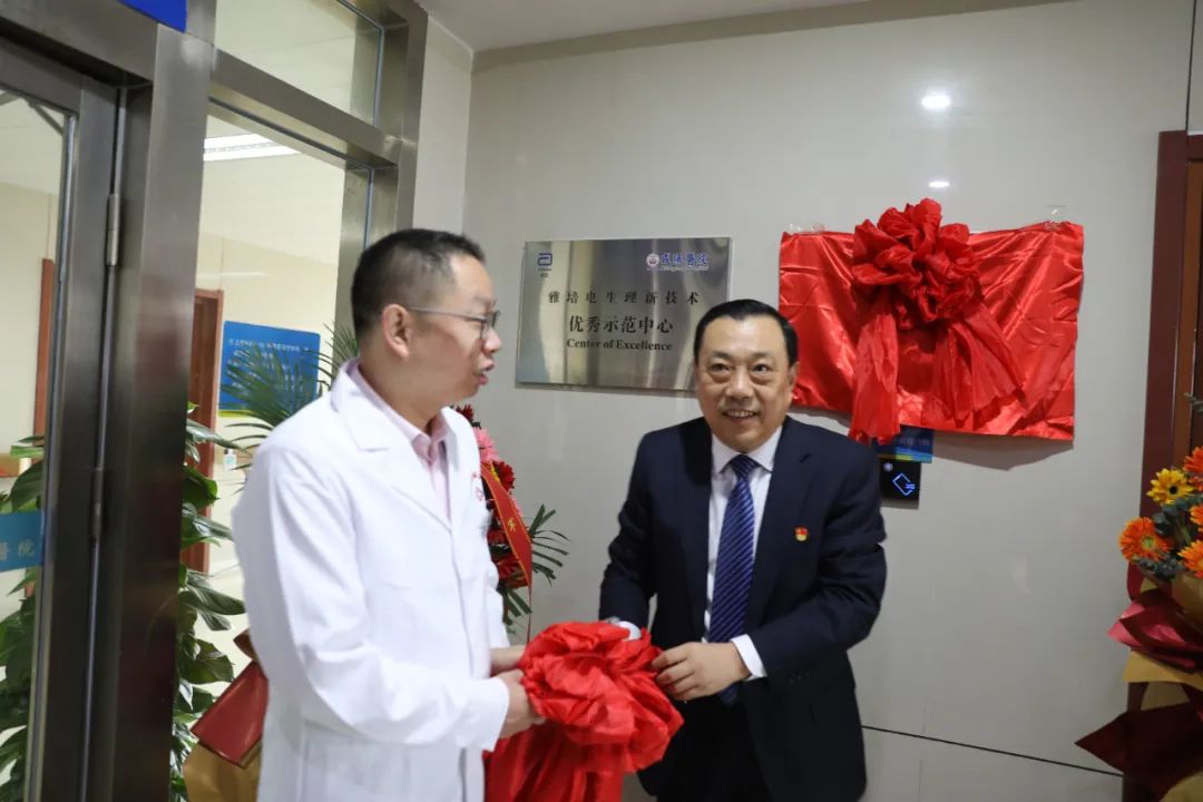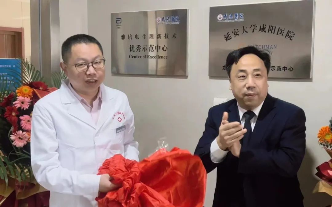精诚医疗集团董事局顾问组组长张群和顾问吴学让为心血管内科十病区揭牌,精诚医疗集团董事局主席兼延安大学咸阳医院董事长李卫军、延安大学咸阳医院院长姚晓峰、心血管病院副院长刘雄涛为左心耳封堵技术培训示范中心、雅培电生理新技术优秀示范中心揭牌。