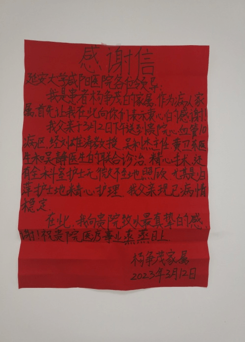 一滴水,可以折射太阳的光辉,一朵花,可以点缀春天的美丽。一面锦旗,一封感谢信,凝聚着浓浓的医患情意,它传递的不仅是患者的感激之情,更是对医护人员最好的肯定和鼓励,对患者倾情服务的最好证明。朴实的言语,鲜艳的锦旗,彰显的是医患之间彼此的真诚与和谐。