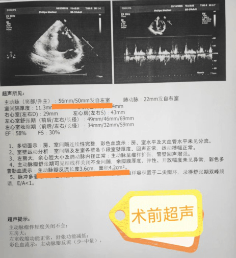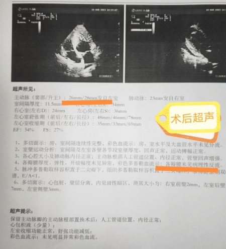患者为69岁老年男性,因“活动后胸闷、气短”入院,心脏彩超提示:主动脉窦部扩张(57mm)伴主动脉瓣反流(4.2cm²),武小刚主任团队亲临超声科会诊查看,结合胸部CT,发现其窦瘤较大,但主动脉瓣瓣叶质地良好,考虑行保留主动脉瓣主动脉根部置换+主动脉瓣成形术。经充分准备,术中精心设计,耐心操作,圆满及顺利地完成了手术,术后患者恢复良好,10天出院,出院前复查心脏彩超:升主动脉直径正常,主动脉瓣未见反流,手术效果满意。