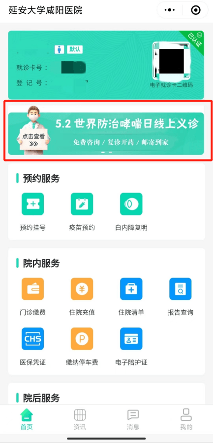 5月2日-5日是世界防治哮喘日宣传活动。在此期间有相关疾病困扰的患者可在“延安大学咸阳医院互联网医院”小程序上免费进行咨询问诊,使您“免费挂号,足不出户就可以在线咨询医生,获得专业的就医指导。”