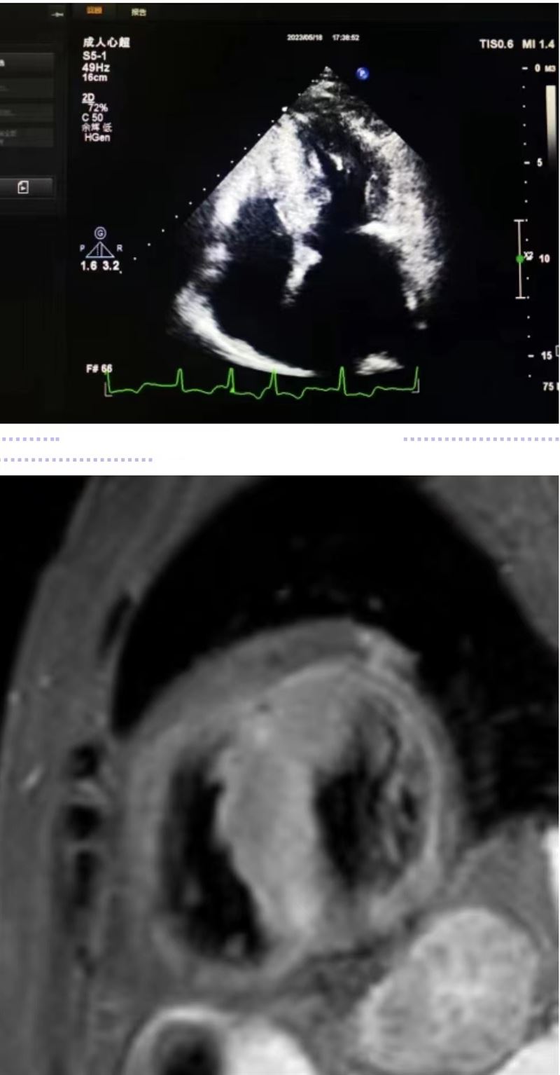 患者女性,69岁,以活动后胸闷、胸痛就诊,入院后完成相关检查,诊断为肥厚型心肌病,但检查结果不能完全解释患者症状。超声医学科王主任与心血管病九病区崔主任、冯主任对病史及相关检查综合评估及多学科会诊后,考虑该患者为隐匿性肥厚型心肌病。
