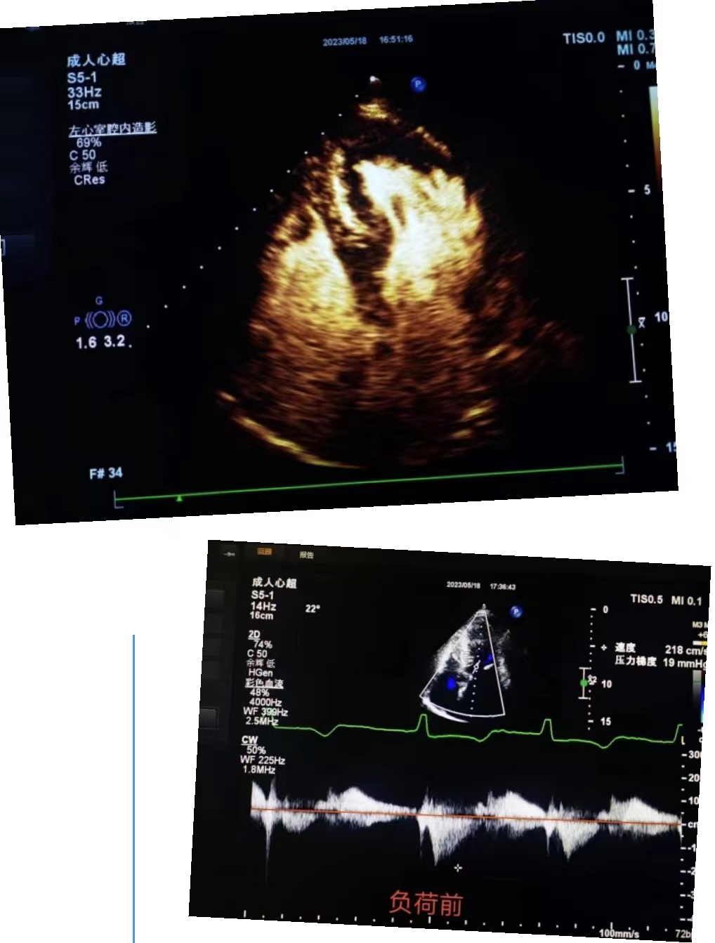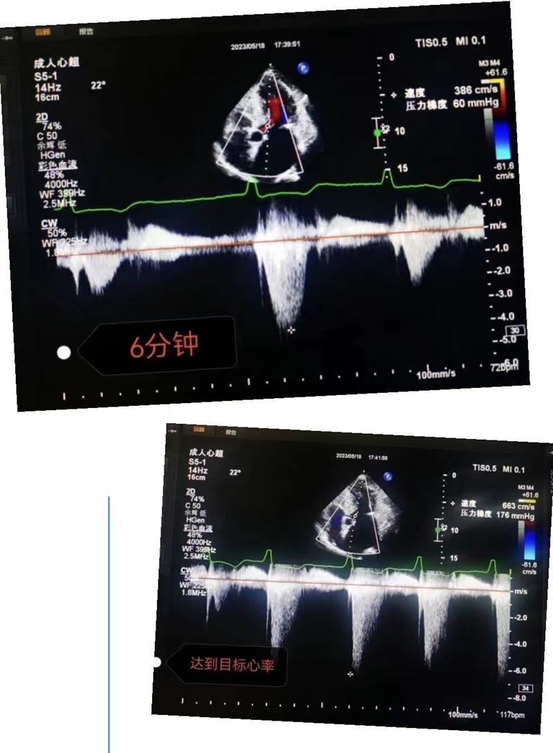超声科王英莉主任及心血管组贾贝主治医师、陈辉主管护师及牛丹青护师为该患者行药物负荷超声心动图。监护仪、急救车到位,常规经胸超声心动图提示室间隔增厚,左室流出道血流速度略增快,左心腔超声造影,可清晰显示室壁显著增厚,符合肥厚型心肌病表现,随后又进行了多巴酚丁胺负荷超声心动图,静息状态下显示左室流出道血流速度V:207cm/s,PG:17mmHg;3分钟后心率达75次/分,左室流出道血流速度V:218cm/s,PG:19mmHg;6分钟后心率达94次/分,左室流出道血流速度V:386cm/s,PG:60mmHg;9分钟后达到目标心率,左室流出道血流速度V:649cm/s,PG:169mmHg,停止用药,药物负荷试验阳性,检查过程中患者无不适症状,最终诊断为隐匿性肥厚型梗阻性心肌病。