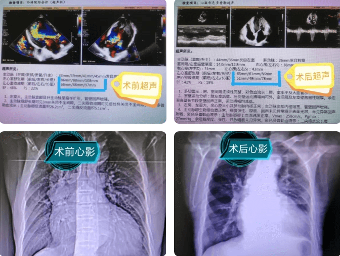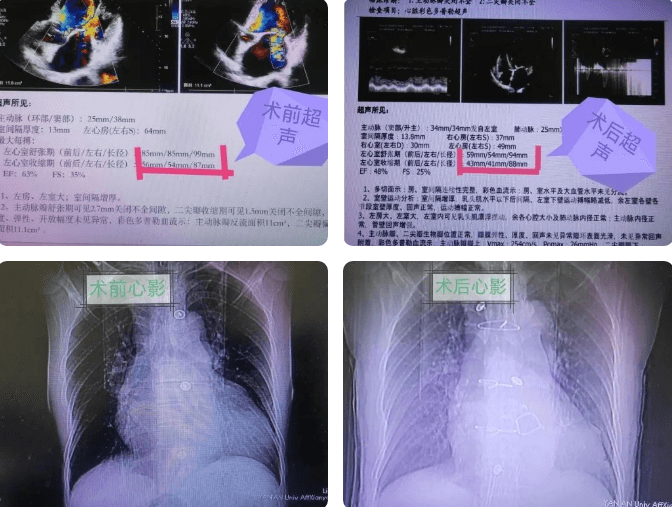 另外一例患者58岁,因急性心衰入院,入院后心脏彩超提示主动脉瓣大量返流,患者既往有发热病史,考虑有感染性心内膜炎病史,左心室显著扩大(左心室86/88/108mm),心功能明显下降。同样,经过强心、利尿、营养心肌等治疗后,反复复查心脏未见缩小,心功能未见好转;经过全科讨论,一致认为患者有外科瓣膜置换手术指征,在全麻体外循环下经过4个半小时的手术,手术顺利,同时验证了患者感染心内膜炎的诊断,细菌已将主动脉壁侵蚀穿孔入左房,患者手术返回病房后,语重声长地说:“自动得病以来,我从来没有这样舒服过,没想到我能通过瓣膜置换手术治疗,让我活了过来。”,术后10天出院,出院前复查心脏超声,心脏已恢复接近正常大小,将来会恢复正常大小。