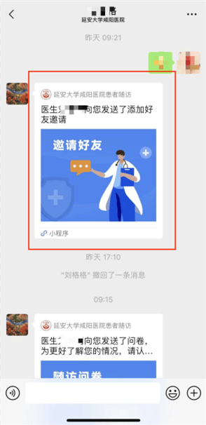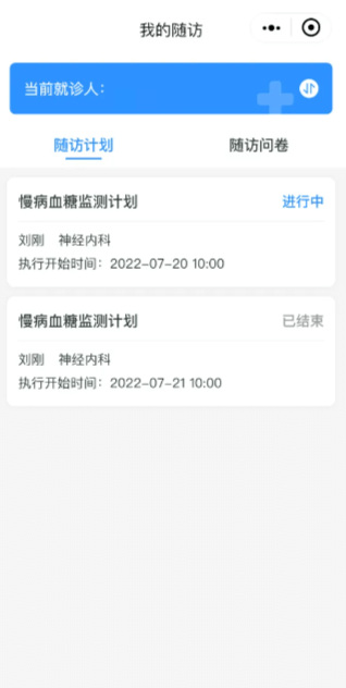 患者在接受邀请时,可选择就诊人。操作成功后,医护人员即可在查看患者病情后制定针对性随访计划。设置成功后,系统会自动运行,按照预设计划对医生进行电话随访提醒,对患者发送复诊通知、换药提醒、二次手术提醒、科普宣教资料、调查问卷等。