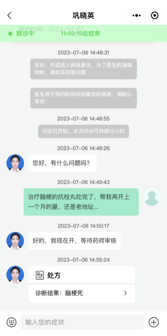 “治疗脑梗的抗栓丸吃完了,帮我再开上一个月的量,还是老地址...。”7月6日下午14时,我院神经内科主任巩小英医生手机出现一条消息提醒,巩主任熟练的登录互联网医院诊疗平台,处理外地患者的诊疗需求。