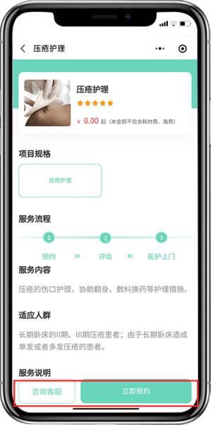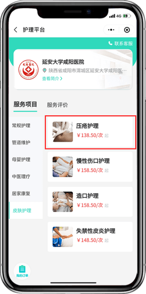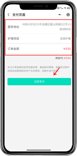 第六步:确认服务地址及护理项目后支付即可,等待护士联系进行护理项目评估