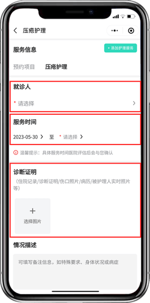 第五步:填写就诊人、服务时间及诊断证明信息