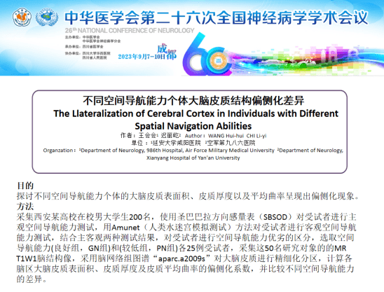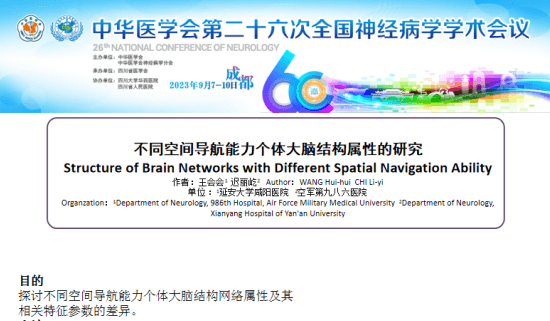 我院神经内科张国勋副主任以第一作者,赵雄飞副院长为通讯作者的论文 《疾病修正治疗药物对复发缓解型多发性硬化症患者认知功能障碍发生风险的影响》和王会会医师2篇论文《不同空间导航能力个体大脑皮质结构偏侧化差异》、《不同空间导航能力个体大脑结构属性的研究》被大会录用并作壁报展出交流。