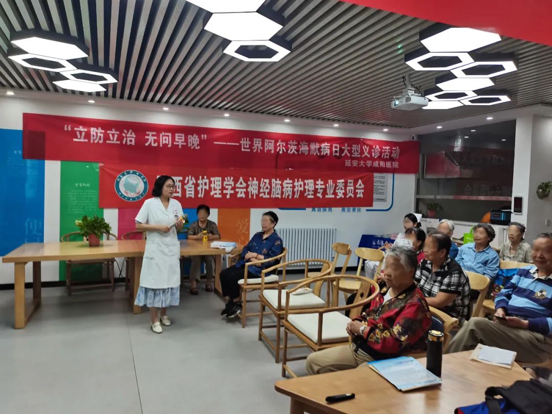 神经内科八病区主任巩晓英带领团队在咸阳纺机老年公寓给老人们讲解阿尔茨海默病的早期识别、十大危险信号以及防治知识,进行认知障碍筛查,使公寓内的老人们对阿尔茨海默病有了更多的认识。