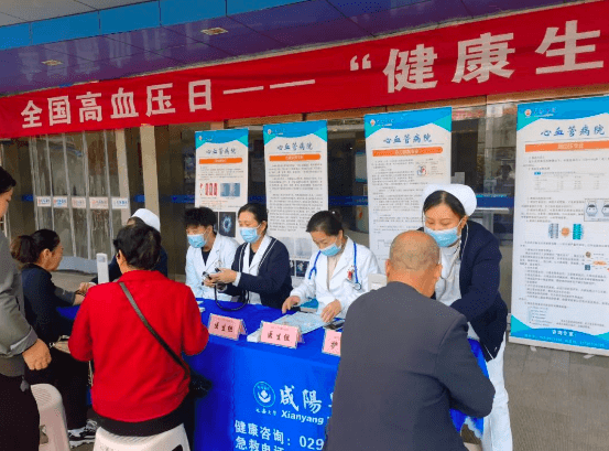 为提高广大人民群众对高血压危害健康严重性的认识,增强全民自我管理、预防为先、降压达标意识。在2023年10月8日是第26个全国高血压日来领之际,延安大学咸阳医院心血管病院在内科病院门诊楼前开展以“健康生活,理想血压”为主题的义诊和健康科普宣讲活动。
