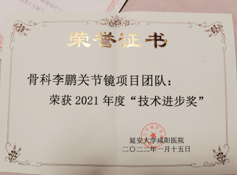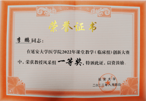 延安大学咸阳医院作为临床教学医院,科室还需要负责本科生教学,规培生、研究生、实习生在骨科临床教学与科研工作,李鹏主任每天在从事上班繁忙工作外,都要抽时间学习查阅医学文献、参加国家级师资培训,线上医学专业、科研培训、钻研医学权威书籍,使自己不断掌握新知识、新疗法、新的诊断思路。目前发表学术论文10余篇。获得国家实用新型专利3项,并完成自主产权手术床临床转化1项,完成新技术新业务8项,并获得关节镜微创技术团队“技术进步奖”,获批陕西省运动与康复临床医学研究中心运动与康复基金项目1项,获批延安大学咸阳医院医院研究生科研创新计划基金项目1项,获得延安大学咸阳医院科技助推计划项目基金1项,2020年获得延安大学课堂教学创新大赛“青年教师”医学组二等奖 ,2022年获得延安大学课堂教学创新大赛“教授风采”临床组一等奖,2022年医师节获得市优秀医师称号,连续多年被评为临床优秀带教、规培基地优秀带教老师。能时刻以优秀共产党员的身份起到模范作用,被评选为优秀共产党员、党员示范岗标兵。