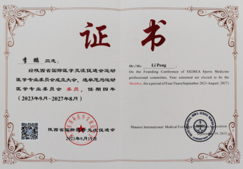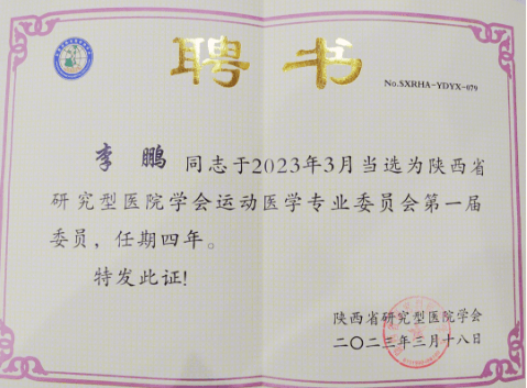 任陕西省国际医学交流促进会运动医学专业委员会委员