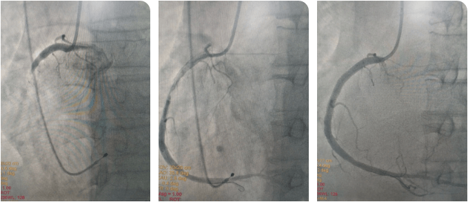 时间就是生命!心内科介入团队与死神展开较量,大家轮流为患者进行心肺复苏,并以最快的速度完成消毒、铺巾。患者大动脉搏动消失,李新国主任、吴利杰主任凭借扎实的基本功,盲穿腋静脉及右侧股动脉,植入临时起搏器。根据心电图判断罪犯血管为右冠状动脉,李新国主任果断直接选择右冠指引导管造影,造影证实判断,右冠状动脉粗大,自近段完全闭塞。12:36介入团队将导丝送到了患者闭塞血管的远端,并用球囊对闭塞血管扩张后顺利恢复前向血流。奇迹出现了,患者微弱的心跳逐渐有力,血压、心律也逐渐好转。此时的患者仍处于昏迷状态,携带呼吸机及临时起搏器转入CCU病房继续治疗。