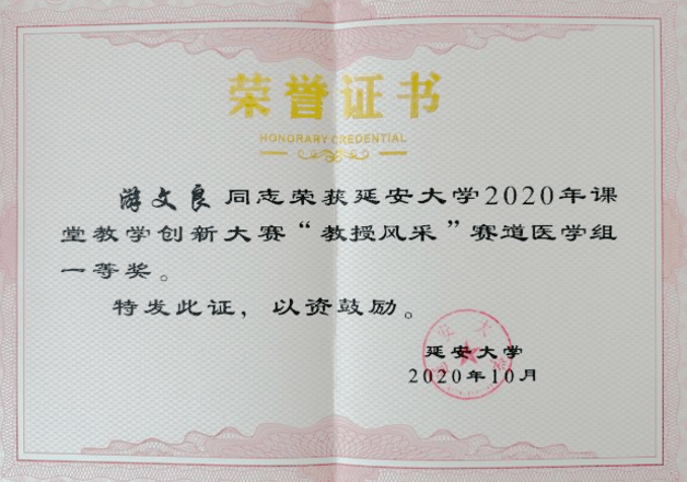 神经外科需要发展就要培养出更多的人才,手术对于医生的专业技能和经验要求非常高。游文良主任采用言传身教的方式让科室医生及学生懂得“神经外科专业的医生不仅要有精湛的医术,还有具备良好的沟通能力和专业的人文素养”。在给延安大学医学院学生授课期间,他通过自己扎实的临床知识、专业的专业技能、生动的传授方式,秉承“传识授业、问题启惑、寻道践新、协导解惑”的教育理念,获得了学生的一致好评。2020年荣获延安大学课堂教学创新大赛“教授风采”赛道医学组一等奖。之后多次指导年轻的临床带教老师参加教学比赛,均取得了满意的成绩,他所带教的学生很多走上临床岗位,成为兄弟单位科室的中坚力量。