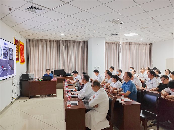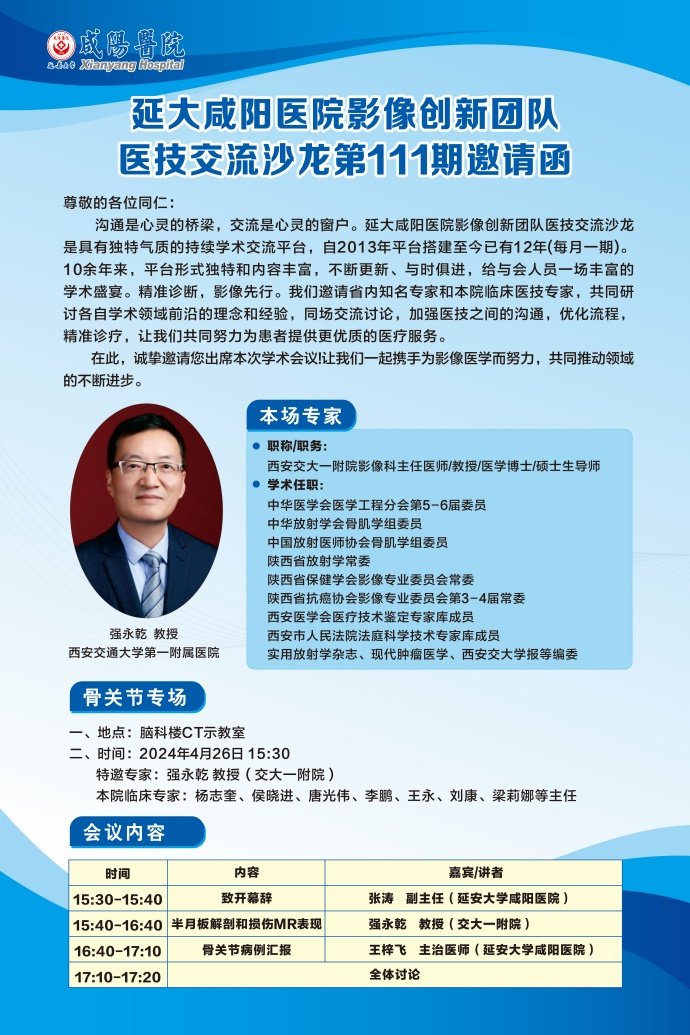 努力沉淀,我们终能成为更好的自己。2024年04月26日,延安大学咸阳医院“第111期临床医技交流沙龙”活动在脑血管病院CT/MRI示教室成功举办,本次会议由延安大学咸阳医院CT/MRI室张涛副主任主持,特邀西安交通大学第一附属医院强永乾教授,我院临床专家骨科一病区杨志奎主任、骨科二病区唐光伟副主任、疼痛科刘康副主任、康复医学治疗区梁莉娜主任、骨科三病区李鹏副主任及其团队,连同我院CT/MRI室医生共六十余人参加本次会议。