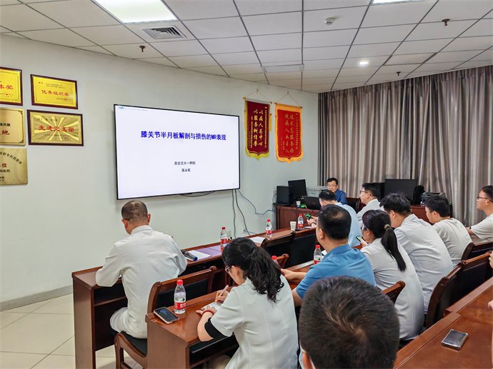 下午三点半,会议正式开始,张涛副主任致欢迎辞,并隆重介绍强永乾教授及莅临会场的各位临床专家。随后西安交通大学第一附属医院强永乾教授致词,对我院近年来的发展给予高度赞许,并对CT/MRI室工作给予肯定。接下来进入学术讲座环节,强教授首先生动形象的对半月板正常的解剖、形态、功能及MRI解剖进行深入浅出地讲解,通过对正常半月板解剖进一步的学习,从而引入今天的重头戏——半月板的变性与撕裂;强教授详细地讲解了半月板变性的分级、撕裂的类型及MRI表现,强调了各类型半月板撕裂的鉴别诊断与意义,最后,向我们介绍了正常解剖结构和正常变异误判并进行小结,并鼓励我们学习最新指南以及接触最新研究成果。强教授再三强调:要把工作做细致,半月板的撕裂部位、分型与临床治疗策略密切相关,我们应把工作做的更细致,为临床提供更多信息以更好地为患者选择最佳治疗方案。