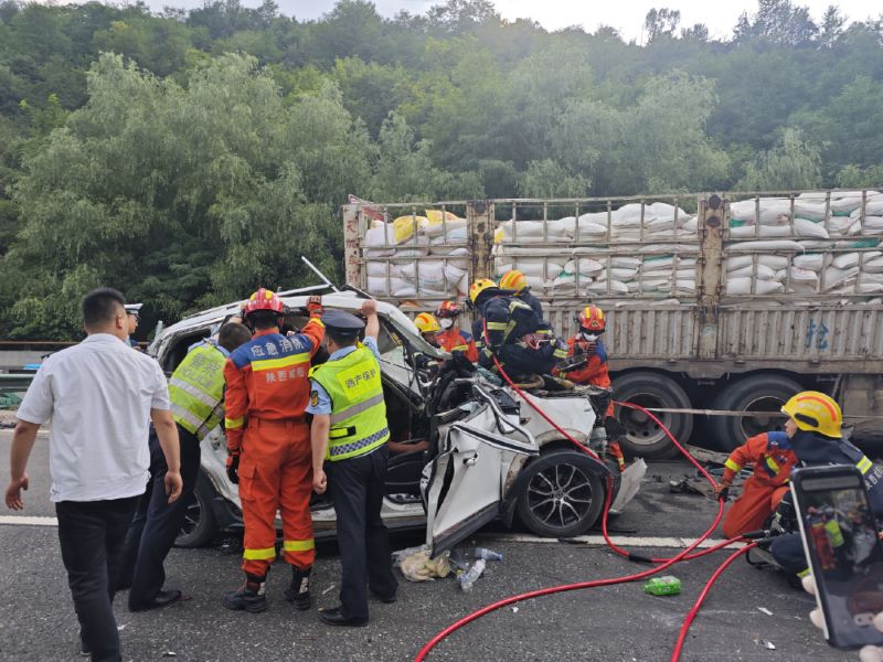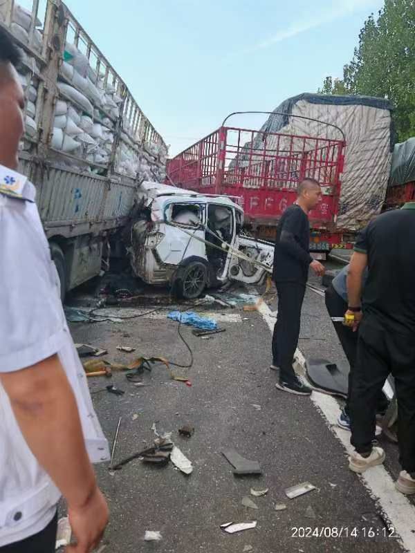 途中,救护车经过永寿县永平镇高速段时,偶遇严重交通事故:一辆白色汽车与三辆货车猛烈相撞,现场混乱,交通受阻。面对此景,随车医护人员立即意识到事态紧急,鉴于附近120尚需时间到达且伤者情况不明,他们毫不犹豫地下车展开救援。