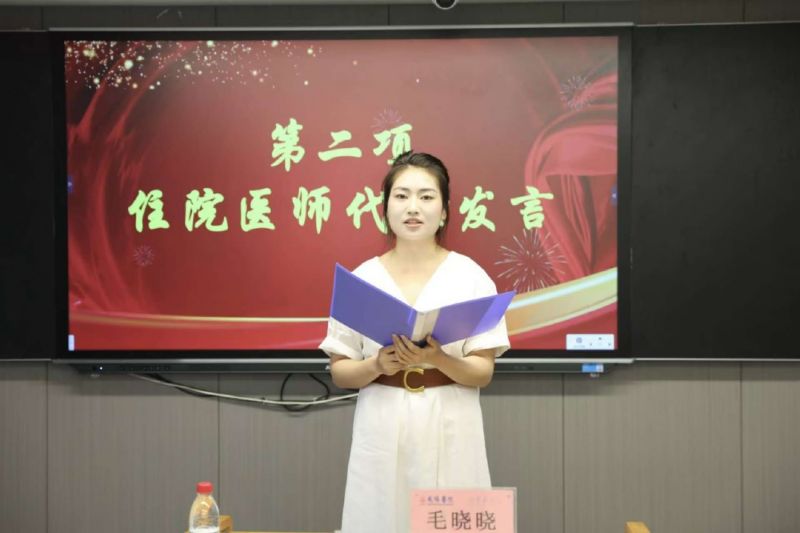 住培医师代表毛晓晓在开班仪式上进行了代表发言,她十分感谢我院提供了此次培训机会,表示在住培期间将以昂扬的斗志、饱满的精神,严格遵守国家规培政策,履行医院及各轮转科室的各项要求,听从住院医师规范化培训管理办公室的管理;认真完成住院医师规范化培训的学习任务,努力掌握好理论知识及各项操作技能,完善跨学科诊疗思维,主动体现爱伤护伤的人文关怀理念,团结协作,挑战自我,超越自我,为成为一名合格的临床医生打下坚实基础。发言完毕后,毛晓晓带领全体学员进行庄严宣誓,重温医学生誓言增强学员责任感、使命感,不忘投身医学事业的初心,铭记“健康所系,性命相托”的誓言,用医者仁心诠释“大医精诚”的深刻内涵。