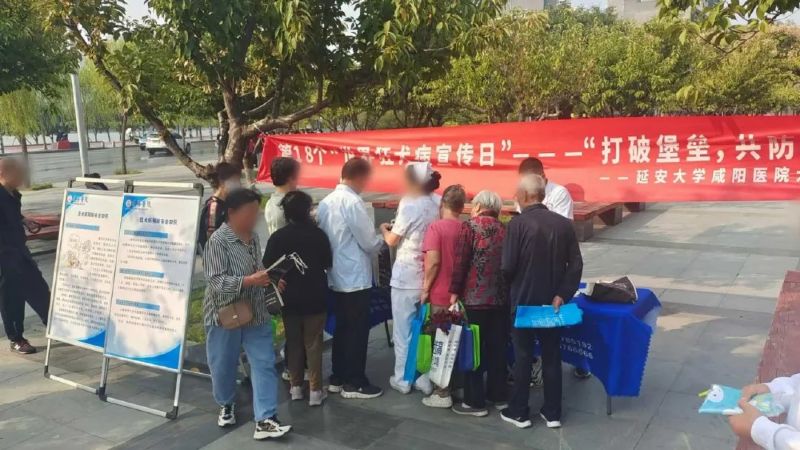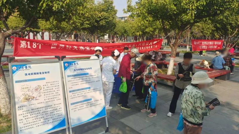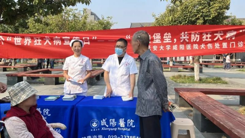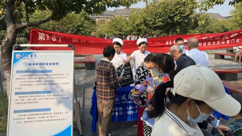 活动现场形式多样,内容丰富,悬挂醒目主题横幅,设立宣传咨询台,精心布置了图文并茂的知识海报,吸引了一波又一波市民驻足观看与咨询。延安大学咸阳医院犬伤规范化处置门诊医护人员充分发挥专业优势,通过现场互动方式讲解展示、分发宣传折页以及面对面咨询方式,向过往群众详细介绍了狂犬病的传播途径、危害及预防措施,特别强调了伤口处置和疫苗接种等暴露后规范处置的重要性。
