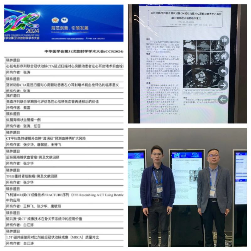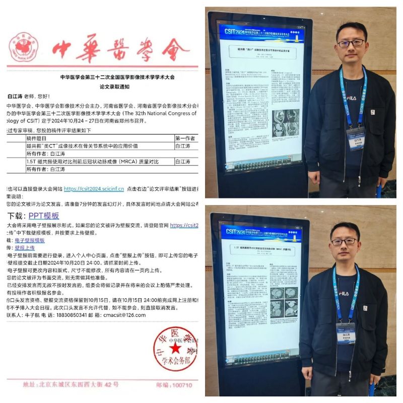 此外,2024年10月24日至27日,在河南省郑州市隆重召开的第三十二次中华医学会医学影像技术学术大会,主管技师白江涛就发表的《磁共振“类CT”成像技术在骨关节系统中的应用价值》、《1.5T磁共振使用对比剂前后冠状动脉成像质量对比》2篇电子壁报进行交流。此次会议以“强基固本提水平,规范同质促互认”为主题,围绕医学影像技术学的最新进展及学术热点展开讨论。