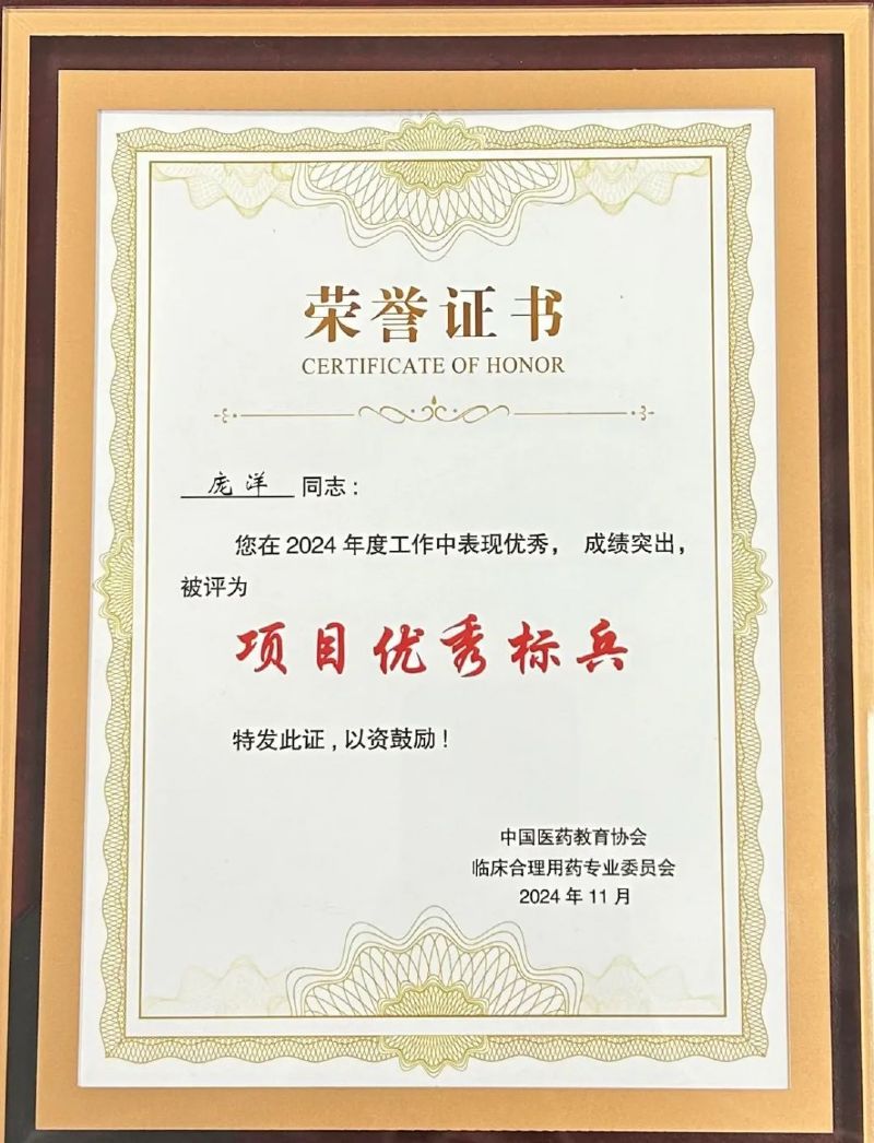 2024年11月23日,第九届中国医药教育大会暨中国临床合理用药大会在天津隆重召开,我院药学部被中国医药教育协会临床合理用药专委会授予“先进集体”,药学部副主任庞洋代表医院接受了表彰,其本人也被授予了“项目优秀标兵”的荣誉称号。