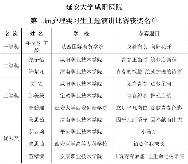 为弘扬南丁格尔精神,树立实习生对护理职业生涯的憧憬和认知,理清成长脉络,立足本职工作,同时为实习生提供展示自我的平台和锻炼成长的机会,在这初冬时节,我院护理教学管理委员会在脑血管病院第三学术厅成功举办以“青春、成长、筑梦、启航 ”为主题的护理实习生演讲比赛。科研教学管理中心副主任陈青、护理教学管理委员会主任委员党文婷总护士长、全体教学管理委员会委员、教学组长以及全体实习生共200余人参加。本次活动由陕西国际商贸学院的王妞妞和安康职业技术学院的张家玮同学主持,教学管理委员会部分委员及部分教学组长担任评委。
