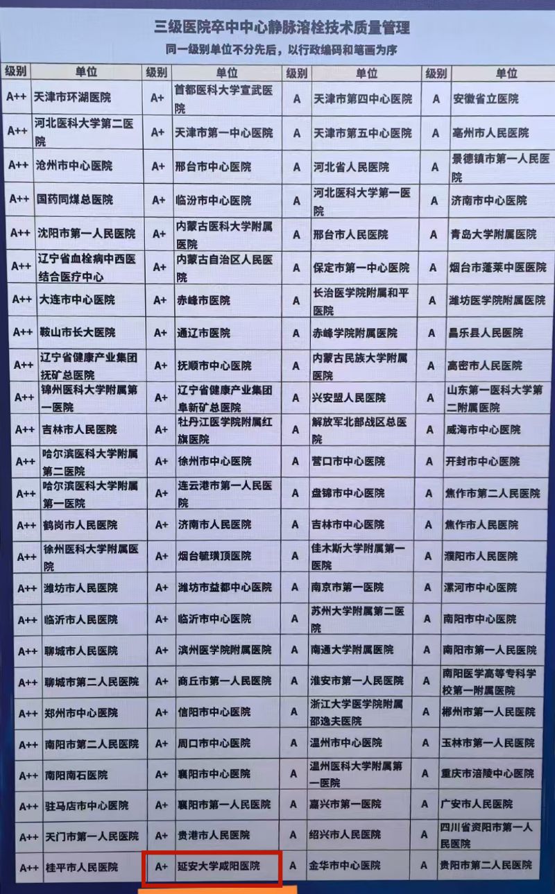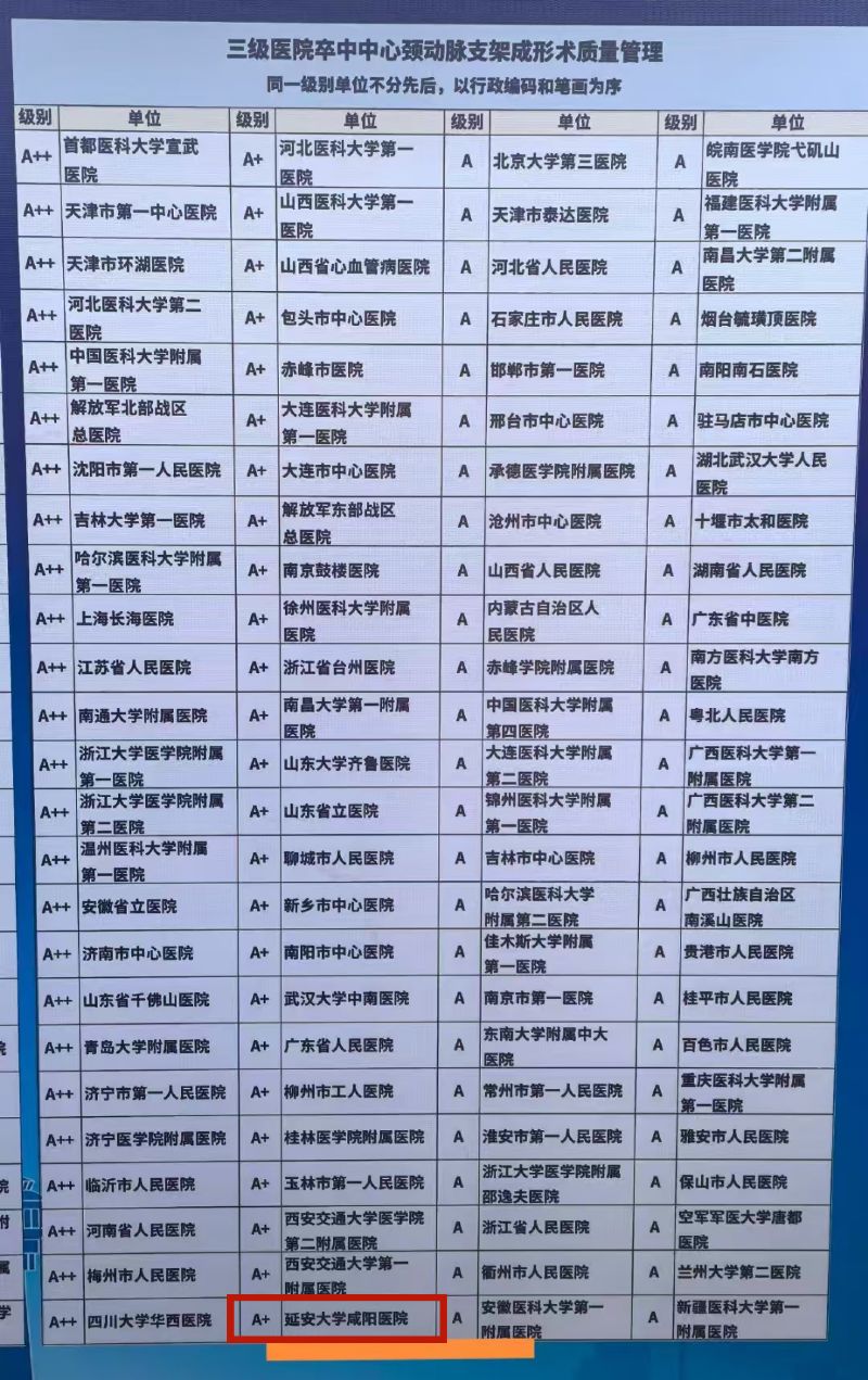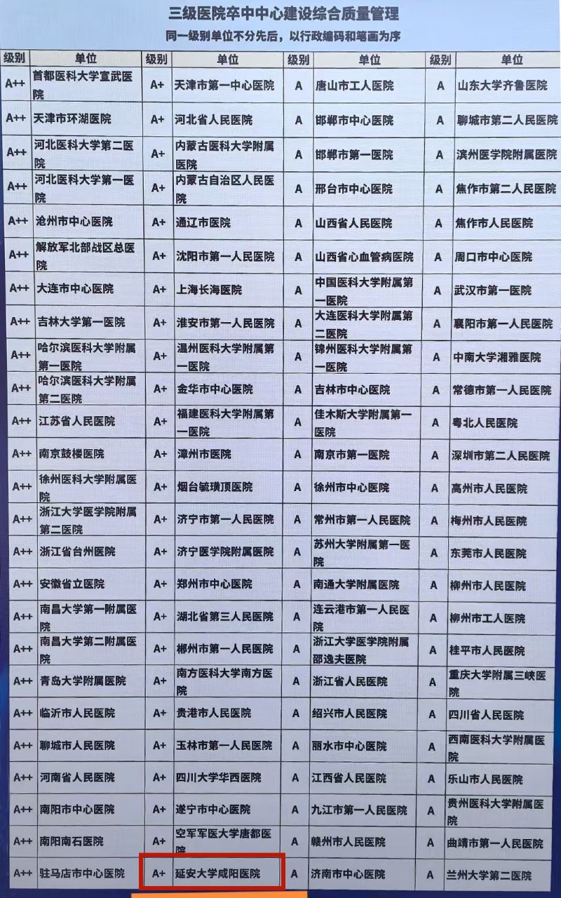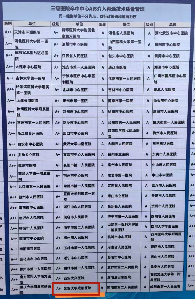 延安大学咸阳医院卒中中心在中心建设综合质量、静脉溶栓、介入再通、颈动脉支架、共四项质量管理指标中全部获得A+。展现出在卒中诊疗领域的强劲实力与专业高度。这一成绩也标志着该中心在急性缺血性脑卒中静脉溶栓、血管内治疗、颈动脉支架等关键指标上达到了国内顶尖水平,为区域乃至全国的卒中患者带来了更高质量的救治希望。