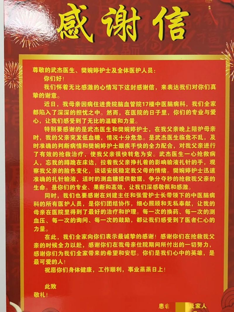 家属们特别指出,患者的康复之路不仅得益于先进的医疗设备,更归功于医护人员的专业精神和周到服务。樊护士在照料患者时总是面带微笑,用温和的语言耐心解答他们的问题,给予了患者和家属极大的心理支持。除了武杰医生和樊婉婷护士,科室的其他医护人员也在患者康复过程中展现了卓越的专业技能和优质的护理服务,为患者的恢复提供了无微不至的关怀。