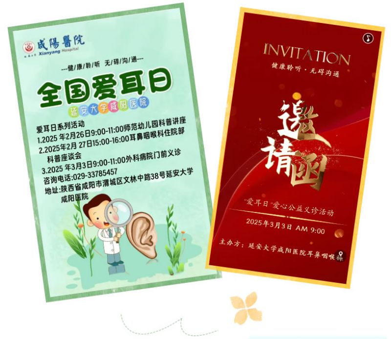 2025年3月3日是第二十六个“全国爱耳日”,今年爱耳日的主题是“健康聆听 无碍沟通”。为了提高公众对听力健康的重视,普及爱耳护耳知识,延安大学咸阳医院耳鼻咽喉科于2月26日至3月3日开展了一系列活动。本次活动在院领导、外科综合办的大力支持下,由耳鼻咽喉科主任张立刚、护士长王小侠牵头,与宣传部、流动医院等多部门协调沟通,抽调工作人员及医疗技术专业人员参与。