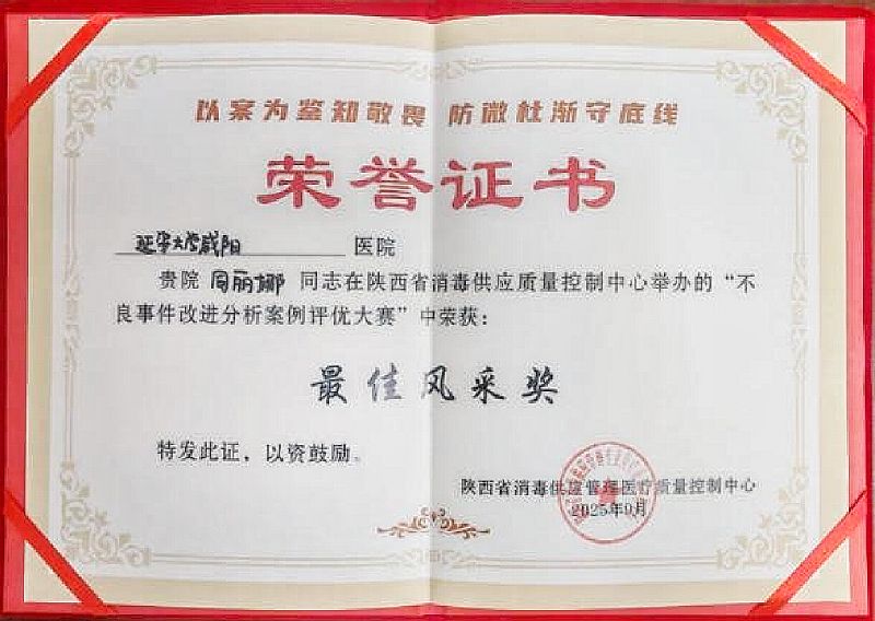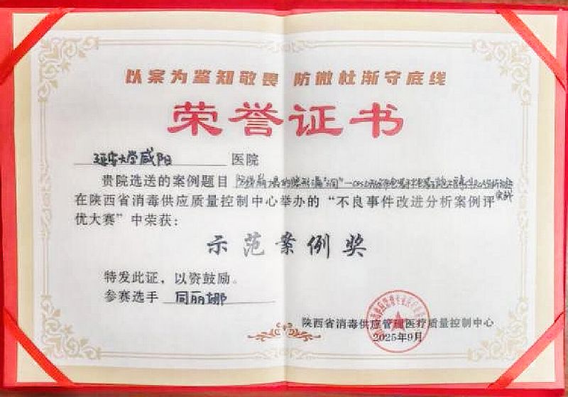 2025年9月12日下午,由陕西省消毒供应管理医疗质量控制中心主办的“不良事件改进分析案例评优大赛”在西安市隆重举行。通过前期案例初评,来自全省各级医疗机构消毒供应中心的12个案例进入决赛同台竞技,聚焦专业难点,共话质量改进。我院消毒供应中心护士长同丽娜代表医院参赛,凭借扎实的专业功底与出色的现场展示,案例《防线崩塌的隐形漏洞—CSSD无纺布包装手术器械破包不良事件RCA分析改进实践》脱颖而出,一举斩获“示范案例奖”和个人“最佳风采奖”两项荣誉,彰显了我院在消毒供应质量管理领域的专业实力与管理水平。