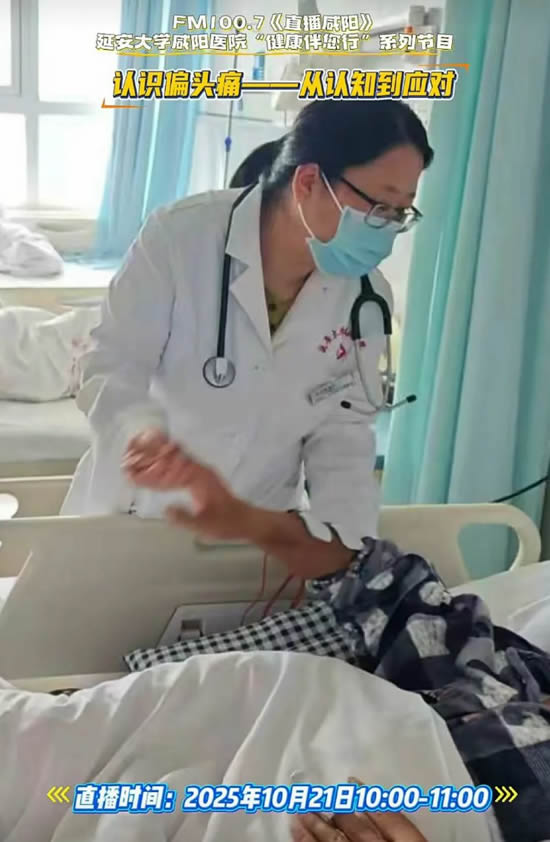 10月21日,神经内科五病区王玉副主任医师受邀参加了咸阳广播电视台FM100.7《直播咸阳》“健康伴您行”栏目,详细讲解了偏头痛相关知识,着重强调了科学认识、科学应对偏头痛,内容通俗易懂。同天下午神内五病区开展了头痛公休座谈会,由陕西省老年专科主管护师任苗开展头痛科普宣讲,咸阳市神经内科专科护师王娟娟带领学习头痛保健操,现场护患互动,受到患者及家属一致好评。