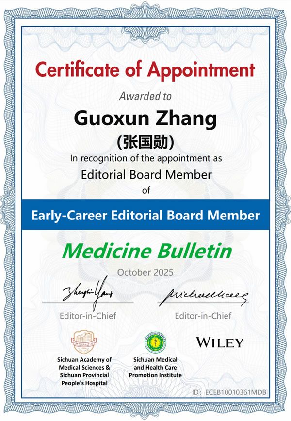 近日,延安大学咸阳医院神经内科张国勋博士正式受邀担任国际英文期刊《Medicine Bulletin》的青年编委。