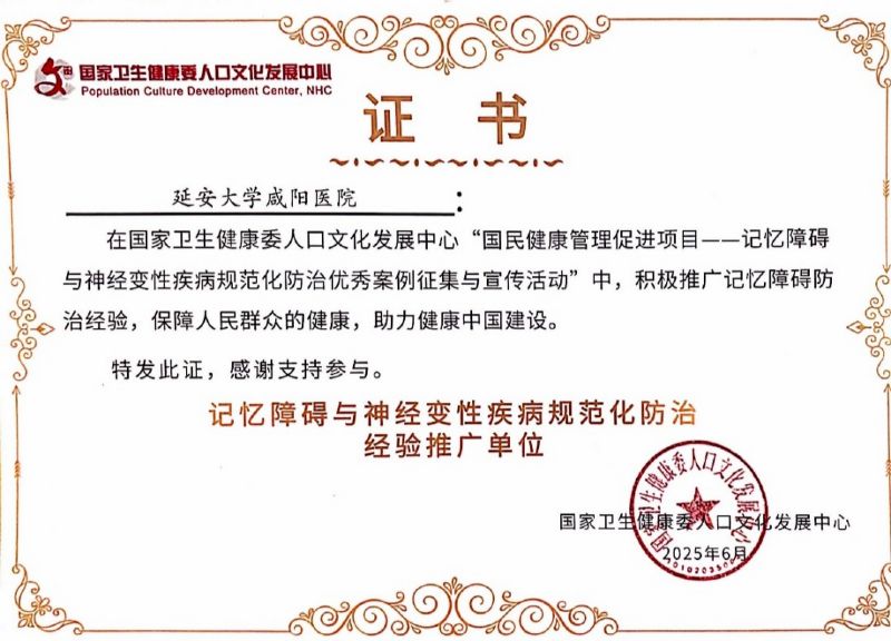 面对人口老龄化背景下认知障碍疾病高发的挑战,延安大学咸阳医院认知障碍专科始终以守护老年人群生命健康为己任。未来,医院将以此次获证为新起点,持续推动认知领域诊疗技术创新与规范化防治经验推广,为助力“健康中国”战略实施、保障区域老年健康贡献更多力量。